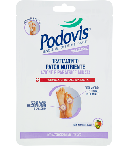Podovis Trattamento Patch Nutriente Il Trattamento Patch Nutriente effettua una profonda azione mirata su talloni screpolati. L'innovativo Trattamento Patch Nutriente agisce in modo mirato sulle zone più soggette a screpolature e callosità come Tallone e Metatarso. La speciale formulazione in Hydrogel agisce sulla pelle del piede già dalla prima applicazione, rendendola morbida e vellutata. Scopri le principali caratteristiche del Trattamento Patch Nutriente: Studiato per agire in modo mirato sulle zone più soggette a screpolature e callosità: talloni screpolati e metatarso. La pelle dei piedi appare morbida e vellutata in soli 30 minuti. Speciale formula hydrogel ad alto contenuto di acqua purificata che rilascia gli attivi in modo graduale, mantenendo la pelle idratata e altamente ricettiva. Tecnologia patch in tessuto microperforato che lascia traspirare i piedi. Con Mango e kiwi, ingredienti naturali dal potere idratante e acido ialuronico. Con vitamina E dall’azione ...