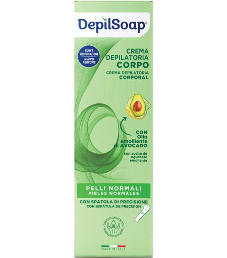 DepilSoap CREMA DEPILATORIA CORPO Descrizione Crema depilatoria per pelli normali, pratica e facile da usare, che agisce in pochi minuti eliminando efficacemente i peli superflui. La formulazione, senza ammoniaca, è arricchita con olio di avocado e acido ialuronico che contrastano l'insorgere di arrossamenti ed irritazioni grazie alle loro proprietà idratanti. Inoltre, la sua profumazione delicata dalle note fiorite, rende l'applicazione del prodotto ancora più piacevole. Modalità d'uso 1. Stendere la crema con l'apposita spatola, contenuta all'interno della confezione, fino a ricoprire completamente la zona da depilare. 2. Lasciare agire per 5/8 minuti massimo, fino a quando, provando a rimuovere parzialmente la crema, non si osserva che la depilazione è perfettamente riuscita. Non superare gli 8 minuti di applicazione. 3. Rimuovere la restante crema aiutandosi con la spatola. 4. Risciacquare accuratamente con abbondante acqua tiepida ed asciugare senza strofinare la cute. Se durante l'applicazione si avverte sensazione di bruciore o prurito rimuovere immediatamente la crema risciacquando con acqua tiepida. Per una maggiore tollerabilità del prodotto, si raccomanda di utilizzarlo su una superficie corporea limitata per giorno, es. un giorno ascelle, un giorno zona bikini ecc., nel caso sia necessario trattare numerose parti del corpo. Componenti Aqua, calcium thioglycolate hydroxide, cetearyl alcohol, PEG-8 stearate, polyglyceryl-3 diisostearate, ceteareth-20, glycerin, paraffinum liquidum, hydrogenated starch hydrolysate, sodium hydroxide, glyceryl oleate, Simmondsia chinensis seed oil, Persea gratissima oil, sodium hyaluronate, lecithin, phytic acid, propylene glycol, PEG-150/decyl alcohol/SMDI copolymer, parfum, titanium dioxide, phenoxyethanol,, cinnamyl alcohol, geraniol, alpha-isomethyl ionone, linalool. Avvertenze Se il prodotto viene usato per la prima volta, è sempre consigliabile effettuare, prima dell'applicazione, una prova di sensibilità applicando una piccola quantità di prodotto in una zona da depilare. Se dopo 24 ore non si è verificata nessuna reazione epidermica, si può procedere all'uso del prodotto seguendo le istruzioni presenti sulla confezione. In caso di prurito, bruciore o irritazioni, rimuovere immediatamente la crema e risciacquare abbondantemente con acqua. Se la sensazione persiste consultare il medico. Prima dell'uso consultare il medico se si stanno assumendo farmaci che possono arrecare effetti negativi sulla pelle. Non usare su pelli irritate, screpolate, con acne o con ferite. Non utilizzare su pelle già depilata con rasoio nelle ultime 72 ore. Evitare il contatto con gli occhi; in tal caso sciacquare immediatamente e abbondantemente con acqua e consultare uno specialista. Non utilizzare deodoranti, profumi, lozioni o sapone prima della depilazione e per almeno le 24 ore successive. Aspettare 24 ore prima di esporsi al sole. Attendere 72 ore tra un'applicazione e quella successiva. Tenere il prodotto fuori dalla... ...