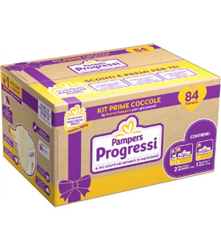 Pampers Progressi - KIT PRIME COCCOLE - Descrizione Pannolino con cuore assorbente, dona protezione e comfort. Il prodotto è studiato per seguire i suoi progressi: quando nasce, il filtrante bucherellato cattura la pupù liquida; per i primi passi è il Pampers più confortevole perché anche da bagnat… ...