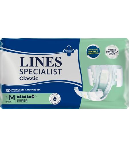 LINES - SPECIALIST CLASSIC SUPER - Descrizione Pannolone mutanda MM. Dispositivo medico. - Assorbe più velocemente: lo speciale canale al centro del prodotto permette al liquido di essere assorbito più velocemente, portandolo lontano dalla pelle. - Nucleo controlla odori: agisce efficacemente e a l… ...