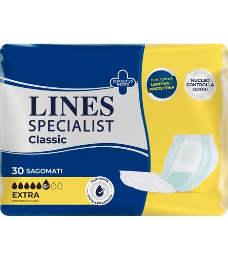 LINES SPECIALIST - CLASSIC SAGOMATO EXTRA - Descrizione Pannolone Lines Specialist Classic Sagomato Extra. - Barriere protettive laterali: aiutano a prevenire le fuoriuscite di liquidi e solidi. - Nucleo Controlla Odori: agisce efficacemente e a lungo contro gli odori, neutralizzandoli. - Lozione l… ...
