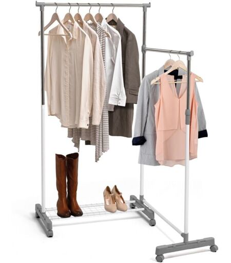Stander appendiabiti angolare con 150 cm di spazio orizzontale per appenderia e una pratica griglia di appoggio alla base. L'angolo e l' altezza sono regolabili in funzione dei propri spazi e delle proprie necessità. Le ruote di cui è fornito permettono di spostarlo con praticità. La portata massima dell'appenderia è di 15 kg: 10kg sulla barra principale e 5kg sulla barra regolabile in altezza. La portata massima della griglia è 3 kg. DomoPak Living appendiabiti angolare con pratica griglia di appoggio alla base Con 150 cm di spazio orizzontale per appenderia, angolo e altezza sono regolabili in funzione dei propri spazi e delle proprie necessità Fornito di ruote per poterlo spostare con facilità Portata massima: 15kg. Di cui 10kg sulla barra principale e 5kg sulla barra regolabile in altezza. La portata massima della griglia è 3 kg. ...