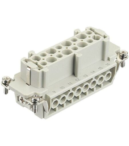 INSERTO FEMMINA 16 POLI PORTACONTATTI PER CONNETTORI INDUSTRIALI Inserto portacontatti senza contatti: no Tipo di contatto: Presa(femmina) Forma: Rettangolare Con custodia: no Numero di poli:16 Corrente nominale In: 16 A Tensione nominale: 450 V Tipo di collegamento elettrico: Connessione a vite Con conduttore di terra: sì ...
