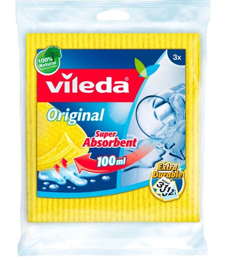 Il Panno Spugna di Vileda, realizzato al 100% con fibre di cotone e cellulosa, risultando particolarmente morbido, assorbente e resistente è indicato per pulire tutte le superfici lavabili, perfetto sia in cucina che in bagno. Vileda Panno Spugna è ancora più efficace rispetto ad un tradizionale panno spugna, perchè 2 volte più spesso e per la sua eccezionale resistenza. Il panno è caratterizzato da strisce ondulate per intrappolare ancora più facilmente al suo interno le piccole particelle di sporco. Sciacquare il panno con acqua calda prima del primo utilizzo. Lavabile in lavatrice a ciclo normale fino a 60°. Composizione: 75% Cellulosa, 25% Cotone. Formato 18x18cm. Confezione da 3 pz. . ...