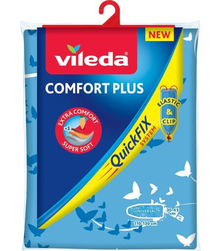 Vileda Comfort Plus è un telo stiro che garantisce la massima scorrevolezza del ferro da stiro sui capi ed assorbe il vapore in eccesso. É composto da tre stati ultra soffici: puro cotone a trama ultrafitta stampato con colori indelebili, uno strato di spugna e soffice mollettone per un comfort superiore. Comfort Plus è facile da applicare grazie a "Quick Fix", un innovativo sistema di fissaggio pensato per semplificare al massimo le operazioni installazione sull`asse da stiro e garantire una perfetta aderenza al piano. Misura universale: 110 - 130 cm di lunghezza, 30 - 45 cm di larghezza. Modalità di applicazione: 1. Stendere il copriasse sul piano stiro 2. Posizionare l`estremità del copriasse provvista di elastico tra il poggiaferro e il piano stiro, assicurandosi che il bordo elasticizzato aderisca bene fino al lato inferiore del piano 3. Posizionare l`altra estremità del copriasse sulla punta del piano e tirare le due stringhe fino al raggiungimento dell`aderenza desiderata 4. Bloccare le stringhe con il ferma corda a molla Grazie allo spesso cordoncino ed al moschettone extralarge inserire le stringhe adesso è ancora più pratico e veloce. ...