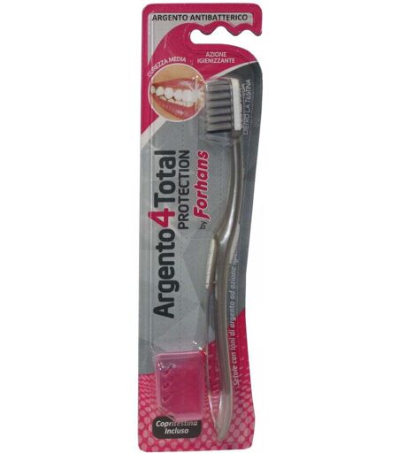 Forhans Spazzolino Silver 4 White Spazzolino antiplacca con Iloni doi Argento, per un’azione igienizzante, ma gentile e non abrasiva sullo smalto dei denti. Caratteristiche Testina con setole di durezza media, dalle punte affusolate per una pulizia efficace, ma delicata. Manico in materiale bi-componente (gomma e plastica), declinato nei colori bianco e nero e argento. Il retro della testina è un pratico pulisci lingua. Formato 1 Pezzo. 1 Copritestina. ...