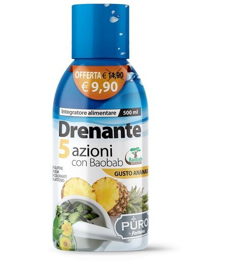 Puro Drenante 5 Azioni con Baobab gusto Ananas 500 mlIntegratore Alimentare per il drenaggio dei liquidi corporeiA cosa serve Puro Drenante 5 AzioniPuro Drenante 5 Azioni con Baobab è un i ...