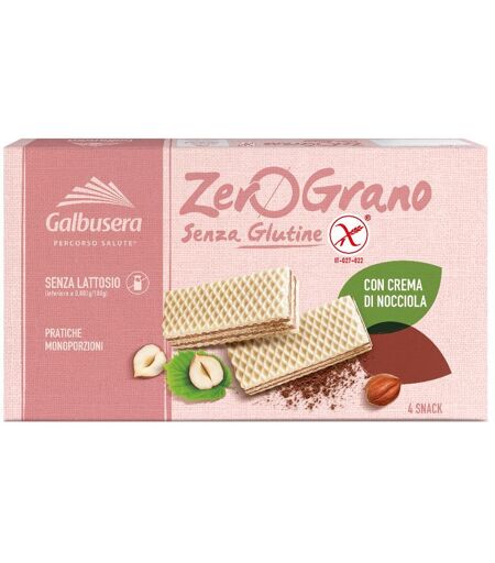 Galbusera - ZeroGrano - WAFER CON CREMA DI NOCCIOLA - Descrizione Wafer con crema di nocciola in pratiche monoporzioni. Senza sciroppi di glucosio e fruttosio. Senza olio di palma. - Ingredienti Crema di farcitura 72% [olio vegetale non idrogenato (cocco), zucchero, amido di mais, nocciole 10%, des… ...