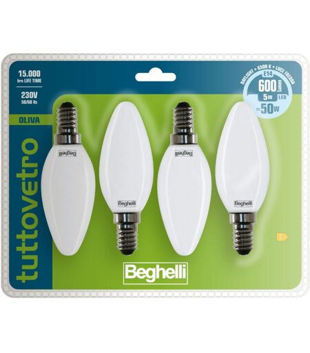 Beghelli - Lampadina LED TUTTOVETRO E14 Luce Fredda, 5W, 600lm, 6500K, Vetro Opale, Efficiente, Facile Installazione, 15000 Ore Durata, Gruppo 4pz,