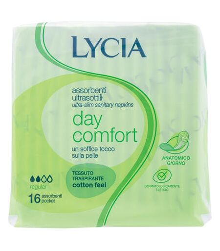 Nuovi assorbenti ultra Lycia ancora piu protezione. morbidezza e asciutto sulla pelle. Super asciutto - Nuovo filtrante con cuore assorbente: cattura il flusso e lo trattiene. Maxi sicurezza - Soffici barriere laterali. contro le fuoriuscite - Maxi morbidezza - Rivestimento Cotton Feel Lycia + estratto naturale di camomilla e proteine della seta. Ultra delicato - Dermatologicamente testato. Mini Spessore meno di 3 mm ...
