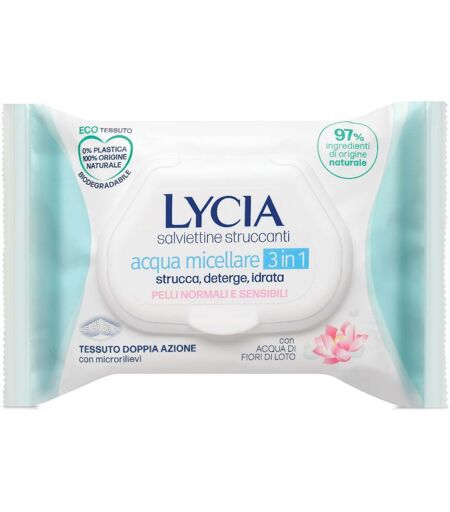 LYCIA - Descrizione Salviettine struccanti all'acqua micellare 3 in 1. Struccano la pelle in un solo gesto lasciandola pulita, idratata e tonica. Formula delicata sugli occhi con acqua di fiori di loto ed eufrasia. Esclusivo tessuto doppia azione di origine naturale biodegradabile: 1. lato con micr… ...