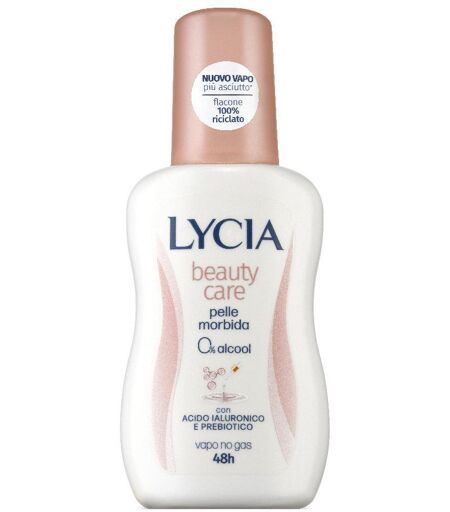 LYCIA - beauty care 0% alcool - Descrizione Deodorante vapo Lycia beauty care. 48 ore di extra protezione. Efficacia garantita combinata al potere idratante dell'acido ialuronico e alle proprietà protettive del prebiotico. Grazie all'antibatterico selettivo, contrasta i batteri responsabili dei cat… ...