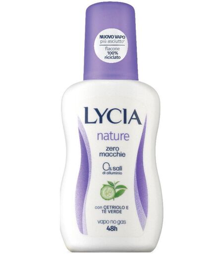 LYCIA - nature 0% sali di alluminio - Descrizione Deodorante vapo Lycia nature. 0% sali di alluminio per 48 ore di protezione con una freca fragranza cetriolo e tè verde. 0% macchie e aloni su tessuti chiari. Formula con antibatterico naturale che rispetta la naturale traspirazione della pelle. Der… ...