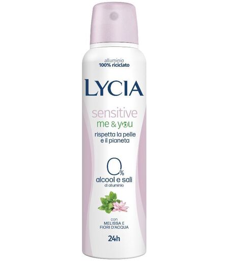 LYCIA - sensitive me &you 0% alcool e sali di alluminio - Descrizione Deodorante spray Lycia sensitive me & you. 0% alcool e 0% sali di alluminio in una formula innovativa adatta anche alle pelli più delicate. 48 ore di protezionee grazie ad uno speciale ingrediente di origine naturale con azione a… ...