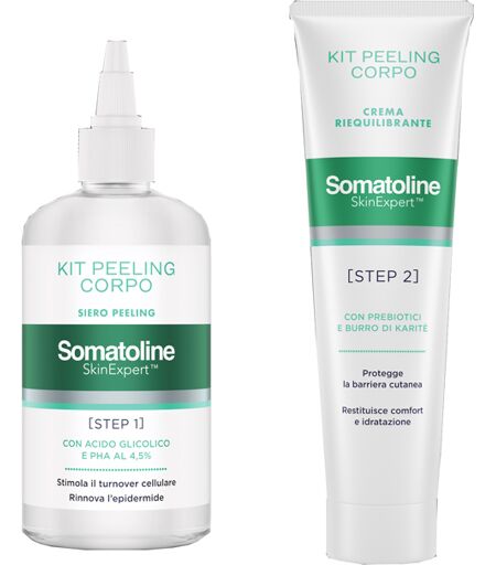 Somatoline SkinExpert - ESFOLIANTE KIT PEELING CORPO - Descrizione Trattamento peeling in due step: - SIERO PEELING; - CREMA RIEQUILIBRANTE. STEP 1 - SIERO PEELING: Siero con acido glicolico e PHA al 4,5%, esfolia la pelle rimuovendo le cellule morte e favorisce la rigenerazione cutanea, stimolando… ...