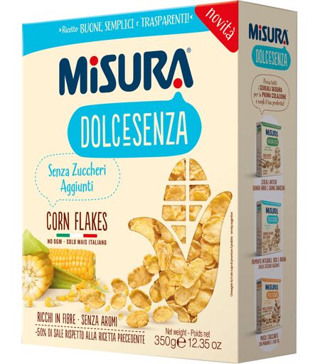 MiSURA DOLCESENZA CORN FLAKES Prodotto ricco in fibre e senza aromi. Senza zuccheri aggiunti. Ingredienti Mais (98%); edulcorante: maltitolo; fibra solubile da amido di frumento; estratto di malto d'orzo; sale; emulsionante: lecitina di girasole. Può contenere tracce di: soia, latte e frutta a guscio. Contiene naturalmente zuccheri. per 100 g per porzione (30 g) Energia 1541 kJ/364 kcal 462 kJ/109 kcal Grassi 1,0 g 0,3 g - di cui acidi grassi saturi 0,2 g 0,1 g Carboidrati 80 g 24 g - di cui zuccheri 2,0 g 0,6 g - di cui polioli 4,4 g 1,3 g - di cui amido 74 g 22 g Fibre (*) 7,0 g 2,1 g Proteine 7,0 g 2,1 g Sale 0,80 g 0,24 g Conservazione Il prodotto ha una validità di 12 mesi dalla data di produzione. Conservare in luogo fresco ed asciutto; non esporre a luce diretta. Formato 350 g Cod. 04842100 ...