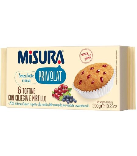 MISURA Privolat senza latte e uova Tortina con ciliegia e mirtilli - Merenda senza latte e uova, arricchita da una farcitura di marmellata di mirtilli e ciliegia. Ingredienti Farina di frumento; zucchero; farcitura alla ciliegia e mirtillo 20% (sciroppo di glucosio - fruttosio, purea di ciliegia 20… ...