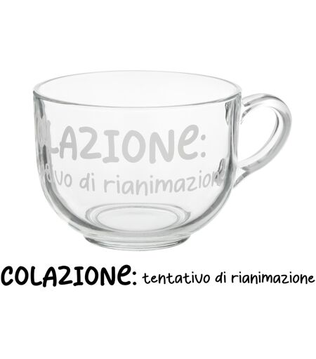 Fai colazione con l'originale tazza della linea Writty per iniziare la giornata con il buonumore. Il design in vetro ha una marcia in più: oltre ad essere resistente e di qualità, ti permette di gustare la tua tazzona di latte o di tè caldo anche con gli occhi! In più c'è l'ironica scritta Colazione: tentativo di rianimazione che porta un sorriso sul tuo volto e ti dà la carica giusta. Maxi capienza di 700 ml. Lavabile in lavastoviglie. ...
