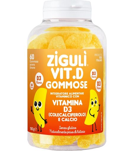 ZIGULÌ VIT. D GOMMOSE Descrizione Integratore alimentare vitaminico. Consigliato per mantenere ossa forti e sane e per il benessere dei denti. Ingredienti Vitamina D3 colecalciferolo, calcio, sciroppo di glucosio, saccarosio, acqua, gelatina alimentare, acido citrico, Shade Strawberry Red-Clear (prodotto da patata dolce, cartamo e mela) E163, aroma limone Senza glutine e naturalmente privo di lattosio. Modalità d'uso Si consiglia la somministrazione di 2 gommose al giorno. Avvertenze Non superare la dose giornaliera raccomandata. Tenere fuori dalla portata dei bambini al di sotto dei tre anni. In caso di alterazione epatica, biliare o di calcolosi, l'uso del prodotto è sconsigliato. Conservazione Tenere il flacone chiuso e in ambiente fresco e asciutto. Validità a confezionamento integro: 36 mesi. Formato Confezione da 60 gommose. ...