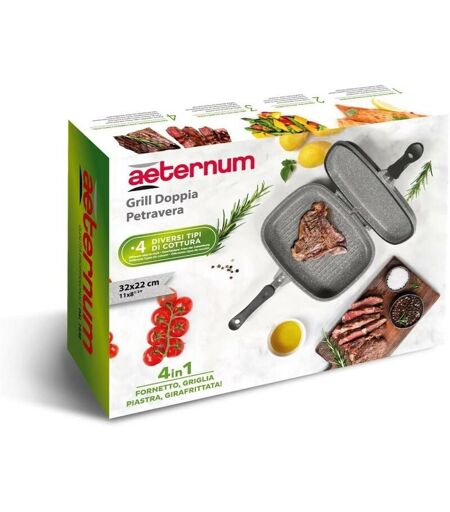 Aeternum Grill Doppia multifunzione (Double Grill) Petravera 32x24 cm, alluminio Grill Doppia 4 in 1: fornetto, griglia, piastra, girafrittata! Forno per cotture veloci e consumi più bassi. Girafrittata, facile da girare. Grill per tutti i tipi di carne e pesce. Piastra per verdure, uova, formaggi e tanto altro. Racchiude numerosissime combinazioni per affrontare ogni tipo di cottura: le padelle possono essere utilizzate separatamente o combinate sfruttando la chiusura a incastro. Il fornetto è in grado di simulare una cottura al forno grazie alla chiusura e alla circolazione interna dell'aria. La doppia superficie riscaldata, una volta sovrapposte le padelle, permette di girare facilmente piatti come frittate e crepes senza alcuna difficoltà. ...