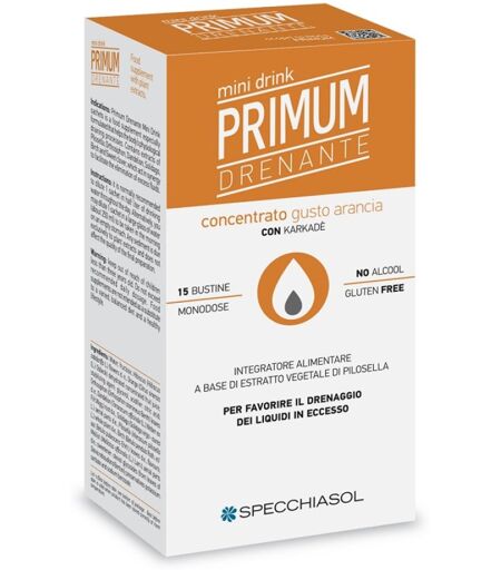 mini drink PRIMUM DRENANTE - gusto arancia - Descrizione Integratore alimentare appositamente formulato per favorire i fisiologici processi drenanti dell’organismo. Contiene estratti vegetali di pilosella, orthosiphon, tarassaco, solidago, betulla e meliloto che agiscono in sinergia per agevolare l… ...
