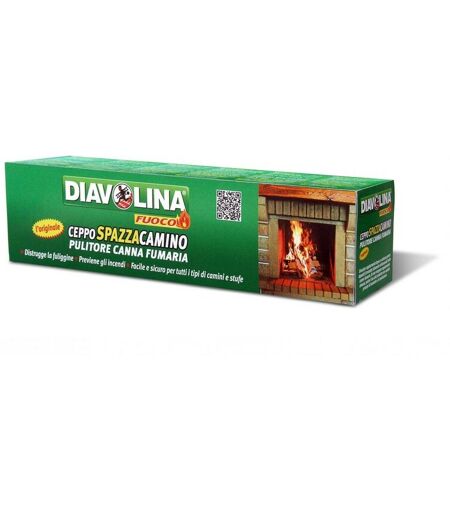Ceppo Spazzacamino per la pulizia delle canne fumarie. Rimuove con efficacia tutti i residui di sporco e fuliggine che vanno a depositarsi nella canna fumaria di camini, stufe e cucine. previene gli incendi aumenta il potere riscaldante ideale per tutti i tipi di camini e stufe Modo d'uso: Fare un buon fuoco per scaldare il condotto e ammorbidire le incrostazioni. Una volta ottenuto un buon letto di braci, inserire Diavolina Ceppo Spazzacamino che si consumerà in 40-60 minuti, secondo l’intensità del fuoco. Ricaricare con il normale combustibile. Si consiglia di usare Diavolina Ceppo Spazzacamino ogni 2 mesi. ...