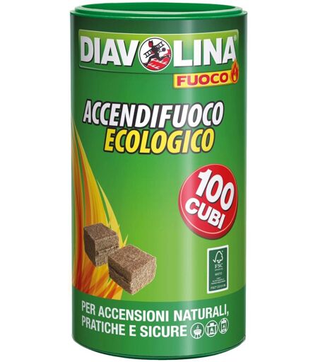 Accenditore Diavolina in una comoda confezione con coperchio. I cubetti a base di legno e cera, provengono da energie rinnovabili. Un connubio di convenienza e praticità per 100 accensioni. Disponibile in vari formati. Confezione da 100 cubetti. ...