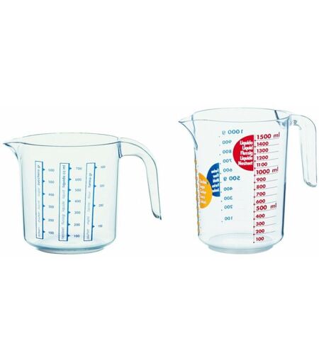 In termoplastica certificata per alimenti, scala graduata per liquidi, zucchero e farina, con becco, superficie antiscivolo, manico laterale, colore trasparente. ...
