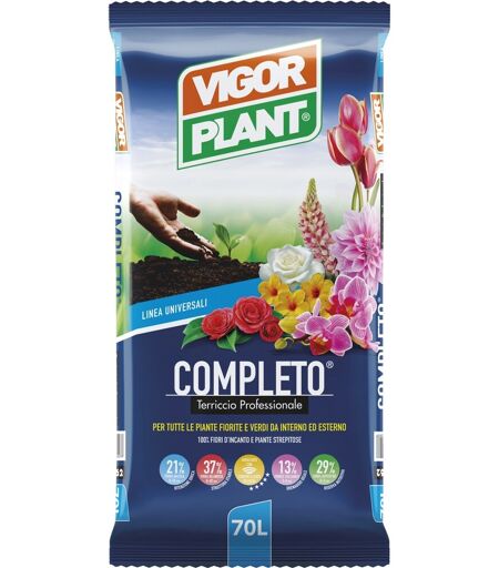Il Terriccio Completo Universale Vigorplant rappresenta una soluzione versatile e completa per la coltivazione di una varietà di piante, sia fiorite che verdi, sia all`interno che all`esterno. Questo terriccio è appositamente formulato per fornire alle piante l`ambiente ideale per crescere in modo sano e rigoglioso. Una delle caratteristiche chiave di questo terriccio è la sua adattabilità a una vasta gamma di piante. Sia che tu stia coltivando fiori decorativi o piante verdi, sia che le posizioni siano all`interno della tua casa o all`esterno in giardino, questo terriccio è pensato per soddisfare le esigenze di entrambi i tipi di piante. La presenza di granuli di concime a cessione programmata è un dettaglio importante. Questi granuli rilasciano gradualmente nutrienti nel terreno, fornendo alle piante una fonte costante di sostanze nutritive essenziali. Questo favorisce una crescita sana e vigorosa, promuovendo fioriture abbondanti e fogliame lussureggiante. Il terriccio è arricchito con macro e micro elementi, che sono nutrienti essenziali per la crescita delle piante. Questi elementi includono sostanze come azoto, fosforo, potassio e altri minerali che contribuiscono alla salute e al benessere delle piante. Formato 70 litri. ...