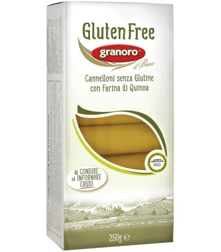 Gluten Free - granoro Cannelloni - Descrizione Pasta senza glutine con farina di quinoa, specificamente formulata per persone intolleranti al glutine. Ingredienti Farina di mais, farina di riso, farina di quinoa (3%); emulsionanti: mono e di gliceridi degli acidi grassi. Può contenere tracce di: uo… ...