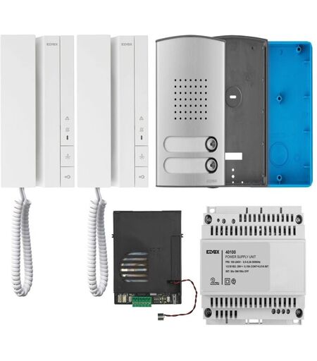 Kit Citofonico Bifamiliare Vimar Elvox sistema 2 Fili Plus composto da: 1 unità elettronica audio codice 40131 1 Placca audio bifamiliare codice 40142 1 Scatola da incasso 1 modulo codice 91K1, dimensioni 96x167x38 mm, colore nero 2 Citofoni cornetta Voxie per sistema Due Fili Plus con 2 pulsanti codice 40540 1 alimentatore per kit citofonici monofamiliari e bifamiliari Due Fili Plus codice 40100 Specifiche tecniche dei singoli componenti del kit: Unità audio 2F+ per placche 40141/40142: Tecnica di installazione Sistema bus, Larghezza 79,70 mm, Altezza 115,60 mm, Profondità 23,00 mm. 1 Placca audio bifamiliare codice 40142: Placca audio da parete o incasso con 2 tasti di chiamata, da completare con unità elettronica 40131, fornita con scatole da parete e da incasso e scheda elettronica R850.B per seconda chiamata, alluminio anodizzato elettrolucidato. Materiale Alluminio, Colore Argento, Altezza 173,60 mm, Larghezza 100,70 mm, Profondità 39,60 mm. 2 Citofoni cornetta Voxie per sistema ...