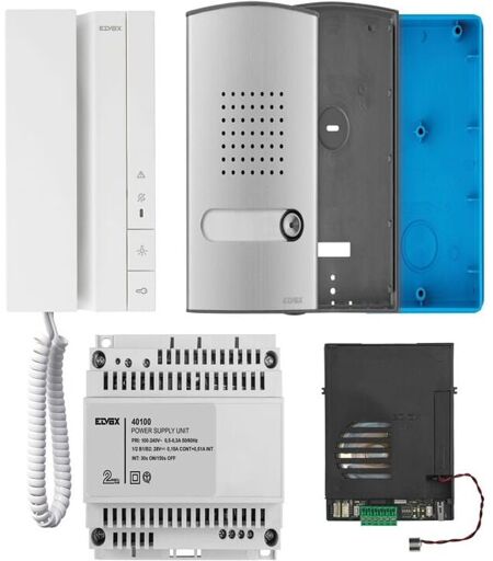 Kit Citofonico Monofamiliare Vimar Elvox sistema 2 Fili Plus, composto da: 1 unità elettronica audio 40131 1 Placca audio monofamiliare 40141 1 Scatola da incasso 1 modulo 91K1 1 Citofono cornetta Voxie per sistema Due Fili Plus con 2 pulsanti 40540 1 alimentatore 40100 Composizione dei Kit: Unità audio 2F+ per placche 40141/40142 Unità elettronica Due Fili Plus per targa audio da utilizzare negli impianti Due Fili Plus come posto esterno con placca 40141 e 40142 Placca audio da parete o incasso con 1 tasto di chiamata, da completare con unità elettronica 40131, fornita con scatole da parete e da incasso, alluminio anodizzato elettrolucidato Citofono cornetta Voxie per sistema Due Fili Plus con 2 pulsanti per le funzioni apertura serratura e servizio ausiliario (luce scale), installazione a parete, bianco Alimentatore per kit citofonici monofamiliari e bifamiliari Due Fili Plus, con uscita 28 Vdc 0,6 A, alimentazione 110-240 V~ 50/60 Hz, installazione su guida DIN (60715 TH35), occupa ...