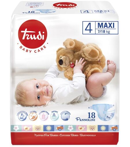 Descrizione Trudi Baby Care Pannolini Bambini Maxi 7/18kg 18 Pezzi - Trudi Baby Care Pannolino Bambini - I pannolini Trudi Baby Care offrono: prestazioni in linea con i più qualificati concorrenti presenti sul mercato; morbide ed elastiche fasce laterali in grado di modellarsi naturalmente al panci… ...