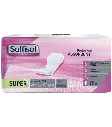Descrizione Soffisof Lady Air Dry Assorbenti Incontinenza Super 15 Pezzi - Soffisof Air Dry - Soffisof Lady è la soluzione ideale per il trattamento dell’incontinenza da lieve a leggera. Le protezioni Soffisof Lady sono discrete, morbide e anatomiche per adeguarsi perfettamente all’anatomia femmini… ...