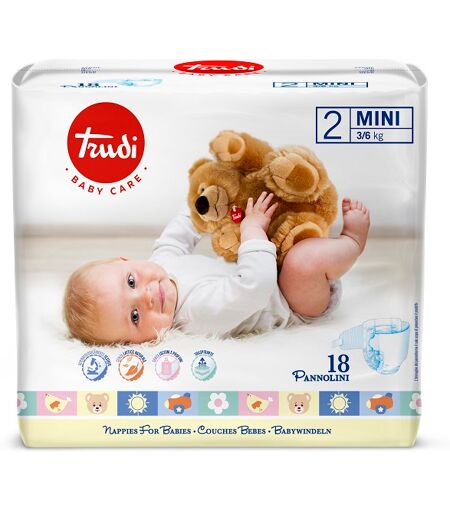 Trudi mini - Descrizione Pannolino baby mini 3 - 6 kg. Materassino assorbente: fluff di pura cellulosa. Polimero superassorbente. Barriera esterna: tessuto in polipropilene accoppiato a film traspirante. Chiusura con adesivi elasticizzati e "velcro". Cod. 1134 ...