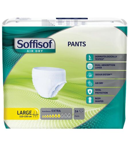 SOFFISOF Pants mutandine assorbenti extra - Descrizione AIR DRY: morbido tessuto esterno traspirante. DERMATOLOGICALLY TESTED: tessuto a contatto con la pelle dermatologicamente testato. TOTAL PROTECTION: elevata sicurezza contro le perdite. DUAL ABSORPTION LAYER: doppio strato assorbente. BODY SHA… ...