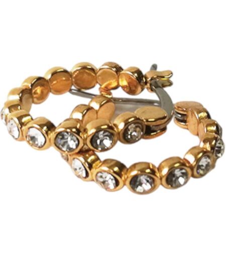 Orecchini Biojoux a cerchio con chiusura a scatto. - Gli orecchini sono in Acciaio Medicale 316L, color oro e a forma di cerchio con una particolare trama che caratterizza tutto il gioiello ed interamente riscoperta da brillanti finemente incastonati. - Perfetti da indossare ogni giorno singolarmen… ...