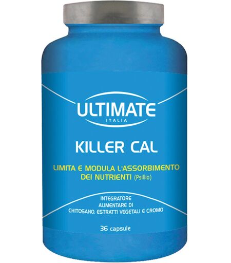 ULTIMATE - KILLER CAL - Descrizione Integratore alimentare coadiuvante nell'ambito di diete ipocaloriche per il controllo del peso. Ingredienti Chitosano, fagiolo bianco e.s. (Phaseolus vulgaris L.: semi, 2% faseolamina 3.000 UIAA/g), gelatina alimentare (capsula), psillio e.s. (Plantago psyllium L… ...