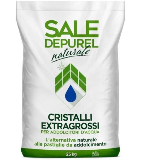 Italkali Depurel – Sale in cristalli per addolcitori 25 kg (09067D) Sale naturale di salgemma in cristalli extragrossi, specifico per addolcitori d'acqua. Altissimo contenuto di NaCl per una rigenerazione efficace delle resine e dissoluzione lenta e costante. Sacco da 25 kg, adatto a impianti domestici e professionali. Leggi di più Specifiche principali Marca/Linea: Italkali Depurel ; Codice: 09067D ; EAN: 8007620090666 . Tipologia: sale di salgemma naturale in cristalli per addolcitori. Caratteristica: grana extra grossa a dissoluzione lenta e costante . Confezione: sacco da 25 kg ; pallet da 40 sacchi (totale 1000 kg circa). Uso previsto: rigenerazione resine negli addolcitori d'acqua. Vantaggi per te Dissoluzione controllata → rigenerazione ottimale delle resine. Sale naturale con alto tenore di NaCl per prestazioni costanti. Formato 25 kg pratico per integri e rabbocchi periodici. Pallettizzazione standard 40×25 kg per gestione e stoccaggio. Dati tecnici Codice prodotto: 09067D — ...