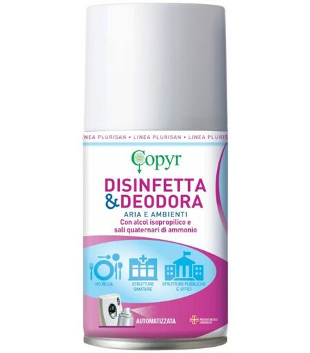 Disinfettante aerosol uso domestico e civile per applicazione con erogatore automatico Copyr. PLURISAN DISINFETTA DEODORA ARIA E AMBIENTI è un germicida per la difesa dai batteri presenti nell’aria. Si usa per applicazioni in ospedali, cliniche, comunità, scuole, palestre, stabilimenti industriali e in tutti quei luoghi in cui è richiesta un’azione antibatterica. Erogatore non compreso ...