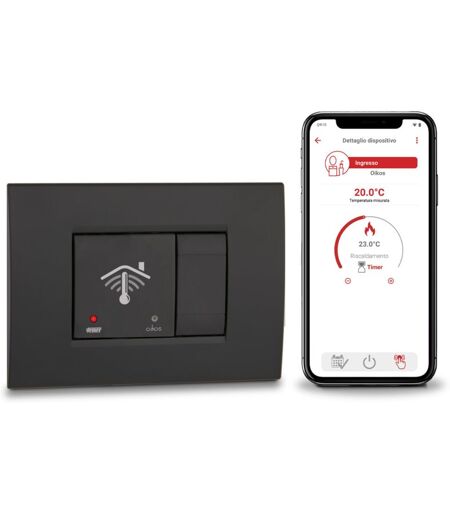 Cronotermostato Wi-Fi da incasso di dimensioni compatte (2 moduli) adatto al controllo di impianti di riscaldamento e condizionamento con programmazione settimanale e alimentazione da rete elettrica. La gestione del dispositivo avviene esclusivamente utilizzando l'App, disponibile gratuitamente per sistemi iOS e Android. La configurazione avviene in modo semplice utilizzando la connessione bluetooth del telefono. La programmazione, l'accensione dell'impianto, la variazione delle impostazioni di funzionamento e la creazione di nuovi programmi sono tutte operazioni che possono essere fatte facilmente e da qualunque luogo ci si trovi grazie al modulo Wi-Fi integrato che connette il dispositivo ad internet attraverso il router di casa. Viene fornito con gli adattatori che lo rendono compatibile con le placche delle principali serie civili. ...