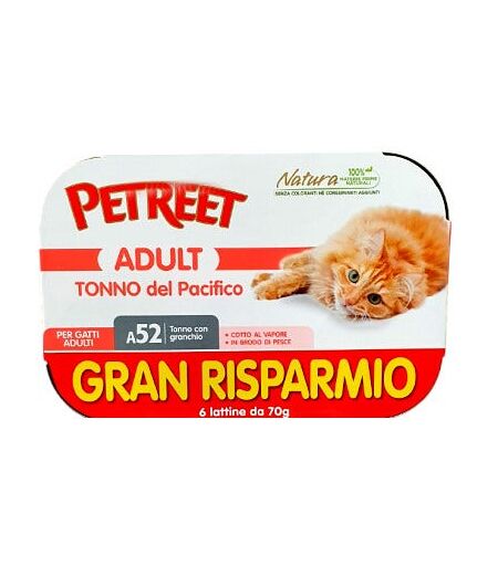 Pregiato tonno del Pacifico cotto in brodo di pesce con granchio. Pregiato tonno e materie prime di alta qualità, accuratamente selezionate, senza coloranti né conservanti aggiunti, cotto al vapore in brodo di pesce per offrire al tuo gatto un pasto ancora più gustoso e genuino. Ingredienti Filetto di tonno 50%, granchio 4%, estratto di proteine di pesce, tonno essiccato, umido di tapioca, riso 1%, prodotti del lievito, sostanze minerali. Modalità d'uso Servire a temperatura ambiente lasciando sempre a disposizione acqua fresca e pulita. Formato 6 barattoli da 70g ciascuno. ...