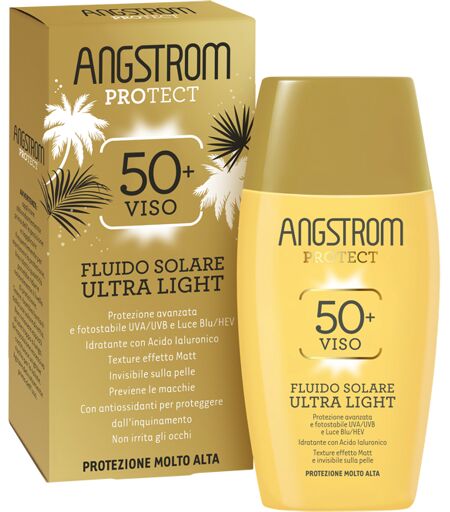 Angstrom Fluido Solare Viso Ultra Light SPF50+ - Fluido solare opacizzante - Descrizione Contiene filtri UVA/UVB avanzati, ad ampio spettro e fotostabili per una protezione immediata. Fluido ultra leggero con Acido Ialuronico idratante, dalla texture molto leggera e di rapido assorbimento, apposita… ...