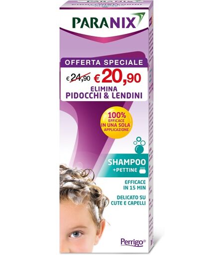 PARANIX Descrizione Shampoo. La formula a Doppia Azione di Paranix Trattamento Shampoo non solo elimina pidocchi e lendini, ma è anche comoda da usare, poiché allo stesso tempo lava i capelli. Controllare la presenza di pidocchi sui capelli asciutti, ciocca per ciocca, utilizzando il pettine antipediculosi a denti stretti incluso nella confezione. Modalità d'uso 1. Agitare il flacone prima dell'uso. Applicare una quantità sufficiente di Paranix Trattamento Shampoo in modo uniforme sui capelli asciutti. Assicurarsi di coprire tutti i capelli ed il cuoio capelluto con uno strato spesso di prodotto. Massaggiare con cura dalle radici alle punte dei capelli, prestando particolare attenzione al collo ed alla zona dietro le orecchie. 2. Lasciare agire per 15 minuti. 3. Prima di sciacquare i capelli, pettinare accuratamente con il pettine antipediculosi Paranix per rimuovere pidocchi e lendini. Pulire il pettine regolarmente. 4. Bagnare i capelli con una quantità d'acqua sufficiente a formare la schiuma. Lavare i capelli e risciacquarli con cura. Assicurarsi di rimuovere tutto il prodotto. Pettinare i capelli come di consueto. Componenti Osmolone, aqua, sodium chloride, Hydroxyethylcellulose, silica, sodium laureth sulfate, cocamidopropyl betaine, diglycerine, starch hydroxypropyltrimonium chloride, sodium lactate, lactic acid, urea, benzoic acid, potassium hydroxide, glycereth-7 cocoate, benzyl acetate, methyl anthranilate, benzyl salicitate, P-cresyl methylether, benzyl benzoate, geraniol, isoeugenol, Helianthus annuus (sunflower) seed oil, benzyl alcohol, dehydroacetic acid. Avvertenze Evitare il contatto con gli occhi e mucose. In caso di contatto con gli occhi, sciacquare abbondantemente con acqua. Se l'irritazione oculare persiste, consultare un medico. Non ingerire. Consultare un medico o il centro anti-veleni in caso di ingestione accidentale. Non utilizzare sulla pelle irritata. Non utilizzare in caso di allergia al profumo o a uno degli altri ingredienti. In caso di eruzione cutanea, irritazione o ipersensibilità sospendere immediatamente il trattamento e lavare i capelli con lo shampoo utilizzato di solito. Tenere fuori dalla portata dei bambini. SOLO PER USO ESTERNO. Questo prodotto è adatto al trattamento dei pidocchi dei capelli (no pidocchi pubici o del corpo). Gravidanza e allattamento Consultare il proprio medico o il farmacista prima di utilizzare questo prodotto. Conservazione Conservare il prodotto in un luogo asciutto a temperatura ambiente (15 °C - 25 °C). Non utilizzare dopo la data di scadenza indicata sulla confezione. Formato 200 ml. Cod. 172690 ...