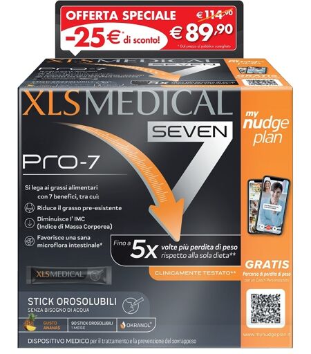 XLS MEDICAL Pro-7 Descrizione Dispositivo medico per un efficace controllo del peso, se abbinato ad una dieta bilanciata e ad una regolare attività fisica. Contiene OKRANOL un complesso esclusivo brevettato di fibre di origine vegetale che è clinicamente testato per legarsi ai grassi alimentari e per perdere peso. Gusto ananas. Modalità d'uso Assumere 1 stick tre volte al giorno, immediatamente dopo i pasti (colazione, pranzo, cena). Si consiglia di prendere lo stick in diverse riprese poco per volta. Se si salta un pasto, prendere comunque 1 stick. Componenti OKRANOL (polvere di okra + inulina), acido citrico, maltodestrina, xylitolo, sorbitolo, polvere di succo di ananas, aroma di ananas, magnesio stearato. Avvertenze Utilizzo raccomandato solo per adulti di età superiore ai 18 anni. Gli adolescenti di età compresa tra i 12 ed i 18 anni possono utilizzare il prodotto sotto la supervisione di personale medico specializzato. Per un effetto benefico delle fibre sul tratto gastrointestinale, si consiglia di bere almeno due litri di acqua al giorno. Una leggera costipazione può verificarsi in caso di un limitato apporto di liquidi. Non assumere: - durante la gravidanza o l'allattamento; - nel caso in cui l'IMC (indice di massa corporea) sia al di sotto di 18,5; - entro 2 ore dall'assunzione di farmaci liposolubili (pillola contraccettiva); - se si è allergici a uno degli ingredienti presenti nella lista. Si prega di consultare il proprio medico curante prima di assumere XLS MEDICAL PRO-7 in caso di una patologia medica pre-esistente, diabete, deficienza di vitamine liposolubili (A, D, E e K); terapia per la riduzione del colesterolo. Tenere fuori dalla vista e dalla portata dei bambini. Non è un lassativo. Non è un pasto sostitutivo. Non superare la dose giornaliera di tre stick. Conservazione Conservare in luogo asciutto a temperatura pari o inferiore a 25 °C. Non usare dopo la data di scadenza. Formato 90 stick orosolubili. Cod. 17121 ...