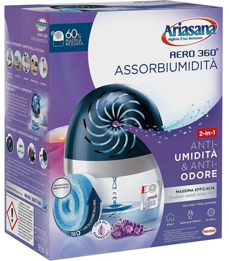 Ambiente domestico salutare con Ariasana Aero 360° Kit assorbiumidità – Previeni l'eccesso di umidità e le sue conseguenze! Non trovi una soluzione rapida per ridurre il tasso di umidità in casa? L’assorbiumidità non elettrico Ariasana Aero 360° è la soluzione giusta! Grazie all'innovativo design, che permette una circolazione dell’aria a 360°, Kit Aero 360° contribuisce a ridurre l’umidità e a creare un ambiente domestico confortevole, prevenendo le spiacevoli conseguenze dell'umidità per la tua casa (condensa, muffa, cattivi odori) e per la tua famiglia (rischio più alto di infezioni, aria non salubre). Con l’innovativa tecnologia 2-in-1 delle TAB Ariasana, il deumidificatore non solo riduce l’umidità in eccesso ma neutralizza gli odori. Ariasana ricarica in TAB è composta da cristalli ultra-attivi e la sua forma ondulata, brevettata Henkel, aumenta la circolazione dell’aria. Inoltre, la pastiglia alla lavanda ha degli agenti anti-odore che neutralizzano i cattivi odori. Il kit ...