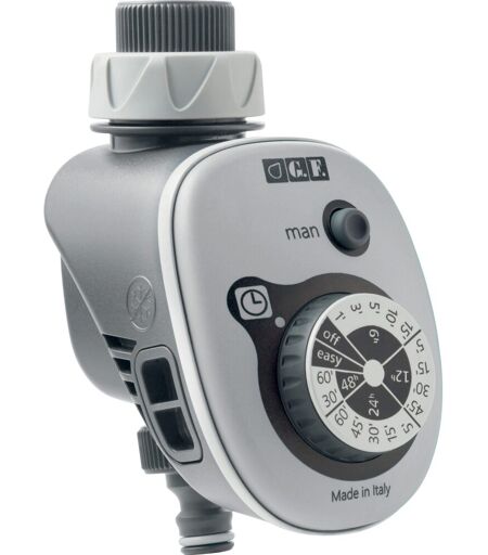 G.F programmatore elettronico irrigazione GF 16 easy. Semplice e affidabile, dispone di programmi combinabili tra loro fino a 16 possibilità, gestibili attraverso il comodo selettore a manopola. Partenze ogni 6, 12, 24, 48 ore con tempi di irrigazione prefissati. Programma "Easy garden" per l`ottimizzazione dei cicli di irrigazione: due irrigazioni giornaliere preimpostate per innaffiare correttamente mattina e sera, migliorando l`assorbimento dell`acqua da parte del terreno ed evitando di danneggiare le piante. Pressione massima di utilizzo 8 Bar, attacco al rubinetto da 3/4", componenti elettronici protetti da acqua e umidità, funziona con batteria alcalina da 9 Volt (esclusa). ...