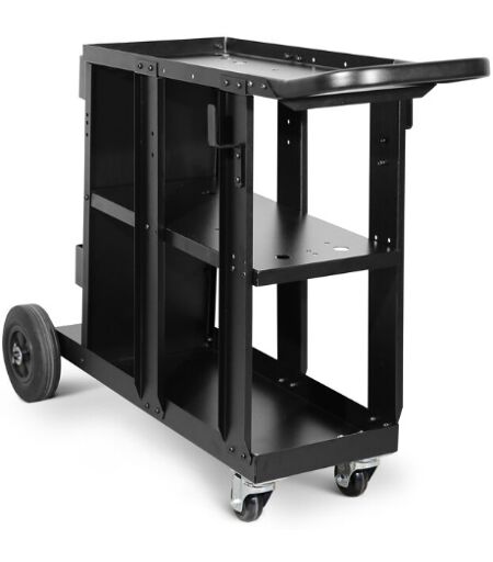 Ottimo carrello per saldatrice (altezza massima 65cm) + bombola (max 40 litri) Con ripiani per accessori, ganci portatorcia e porta cavi Dimensioni: 1130 X 430 X 840mm Dimensione piano superiore: 630x310mm Dimensione piano intermedio: 610x290mm Per saldatrici Telwin: Technomig 215 - 260 - 240 wave Electromig 220 Superior Tig Technology Tig 230, 202, 222 ...