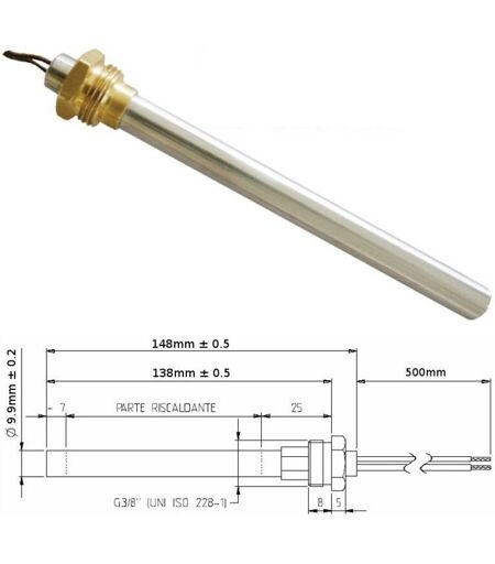 RESISTENZA CON RACCORDO 3/8 DIAMETRO 9,9mm LUNGHEZZA 148mm 300W. Monta su stufe AMG - CADEL Resistenza, candeletta di accensione per stufe a pellet, HT62649, adatta per l'accesione del pellet e cippato per stufe, caldaie e bruciatori. Compatibile HT56135 Per stufe AMG - AMBIENTE E CALORE - KALON - GOOD FIRE - CADEL mod. Adina - Aida - Chantal - Cristal - Diana - Family - Martina - Melody - Miriam - Miki - Moon - Nice - Leonora - Lisbona - Vanessa - Solaris - Valery - Wall Testata per oltre 10.000 cicli di ON/OFF, con tempi rapidi di accensione. Esecuzione con raccordo filettato 3/8 GAS, diametro 9,9mm, lunghezza totale 148mm, lunghezza sottobattuta 138mm, 300Watt. ...