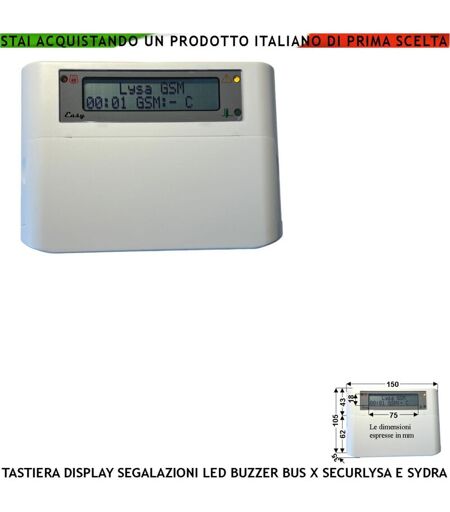 LISTA DETTAGLIATA COMPONENTE - CARATTERISTICHE REALI E FUNZIONI NELLA SCHEDA TECNICA •01 SV-TSF Tastiera retroilluminata Display su 2 Righe con buzzer Alim. 12V dc Espansione Lysa GSM Sydra evo •01 SV-GAR Certificato Garanzia 24 Mesi. A Vita Contro i Difetti di Fabbrica: Installazione Qualificata D.M. 37/2008 •01 SV-IST Istruzioni Dettagliate di Montaggio da Rispettate: Fissaggi Misure Collegamenti Riportati Nel Manuale CARATTERISTICHE GENERALI DEL PRODOTTO COMPLETO DI TUTTE LE PERIFERICHE SV-TSF La tastiera Easy retroilluminata con display LCD su due righe che consente il controllo della centrale Lysa GSM versione Evo. Le digitazioni effettuate su una delle tastiere collegate, viene riprodotta sulle altre compresa la centrale. Quindi sarebbe possibile frammentare i comandi da una tastiera all&rsquo,altra,; la centrale li registra sempre. Dispone di un buzzer per la segnalazione fonica del cambio di stato e di tre led per evidenziare gli stati del sistema: inserito, zone aperte, eventi ...